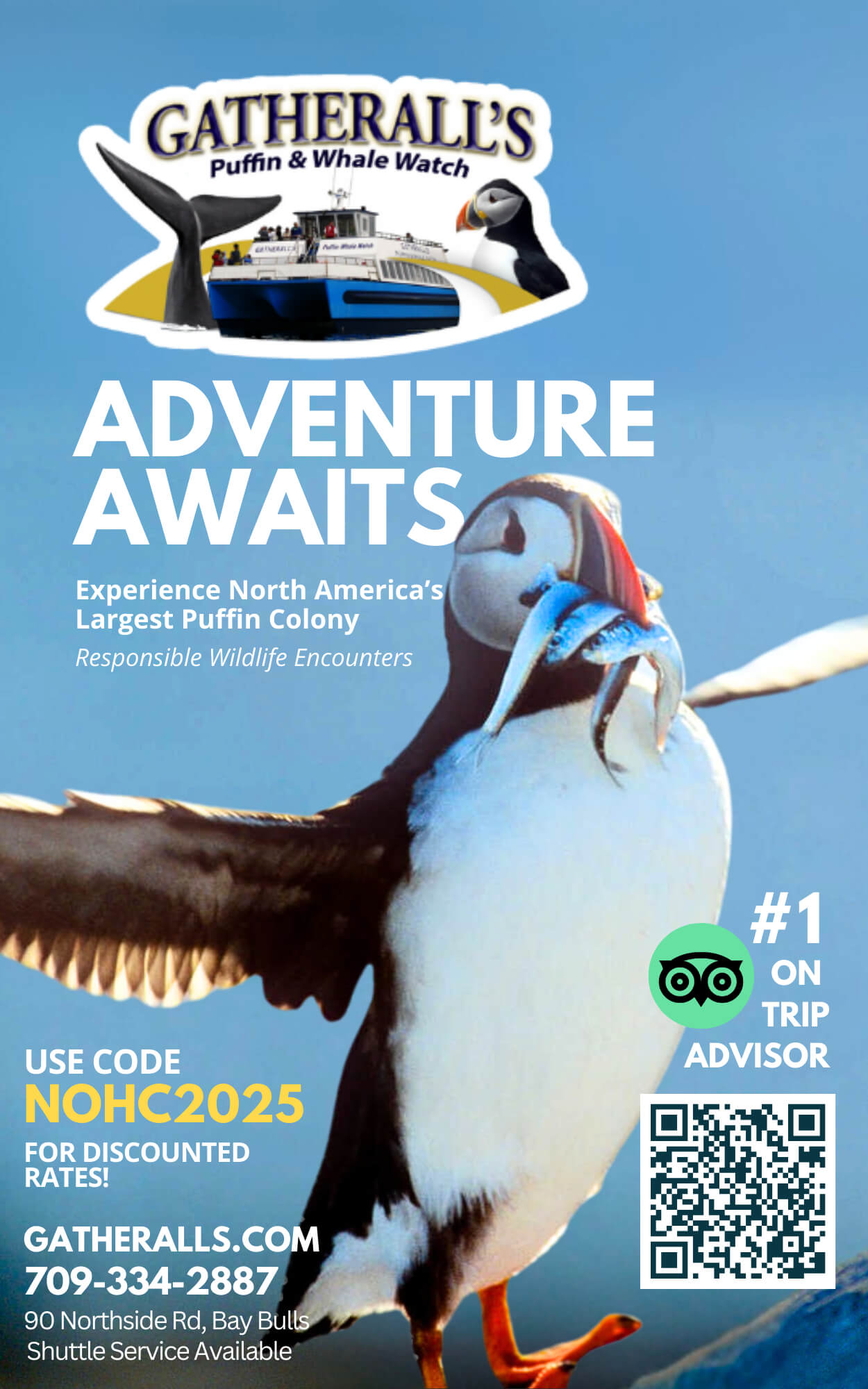 Set sail with Gatherall's Puffin & Whale Watch for a fun, educational adventure! Visit North America’s largest Puffin Colony home to over 2.5 million seabirds! Learn about Newfoundland’s marine wildlife from expert guides as you watch humpback whales explore the ocean’s surface. This tour offers the perfect blend of excitement and insight, giving you a deeper appreciation for the ocean and its incredible creatures.